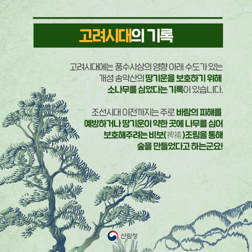 고려시대에는 풍수사상의 영향 아래 수도가 있는 개성 송악산의 땅기운을 보호하기 위해 소나무를 심었다는 기록이 있습니다.