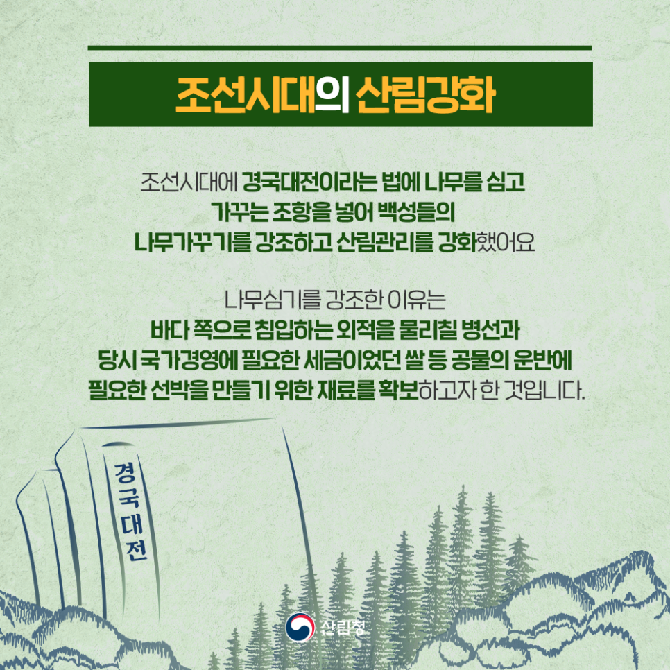 조선시대에 경국대전이라는 법에 나무를 심고 가꾸는 조항을 넣어 백성들의 나무가꾸기를 강조하고 산림관리를 강화했어요.