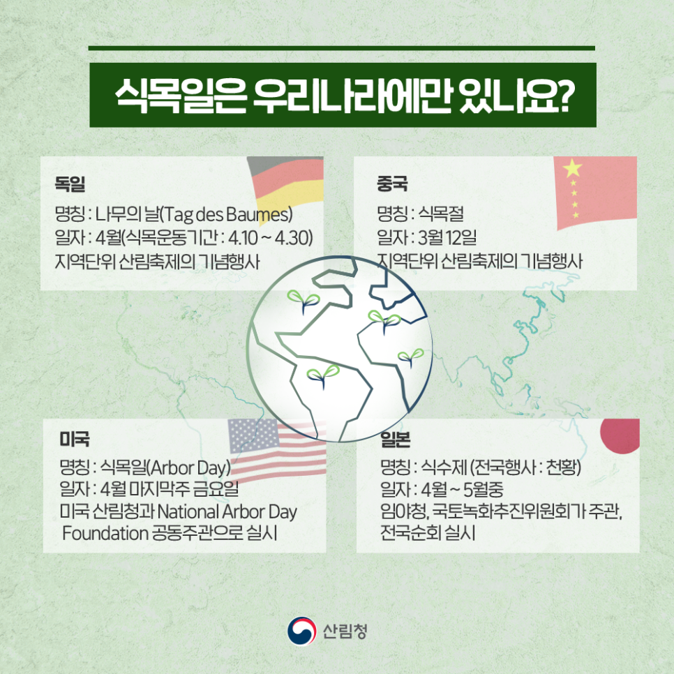 식목일은 우리나라뿐 만 아니라 세계 각국에서도 시행하고있습니다.