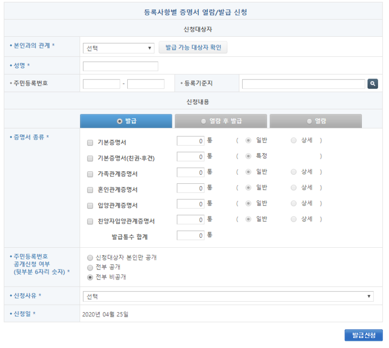 6. 신청대상자 정보를 입력(본인을 선택할 경우 자동입력됨) / 증명서의 종류를 선택합니다.
