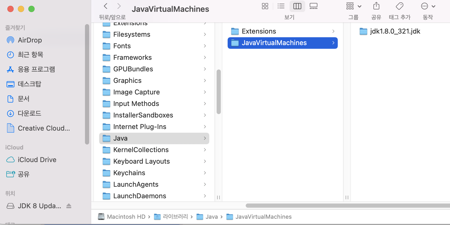 내 finder가 보고 있는 위치가 어디든,, 가장 상위의 하드를 클릭해서, 라이브러리-Java-JavaVirtualMachines를 찾아 들어가면 설치된 자바버전을 확인할 수 있다.