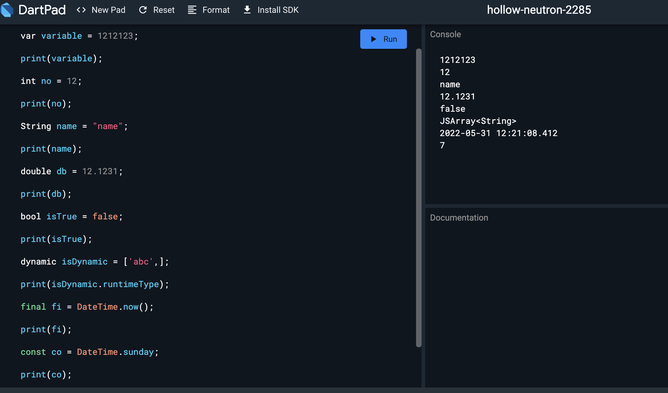 직접 dartpad에 입력해보며 콘솔창에 나오는 값을 확인하며 진행하는것을 추천한다.