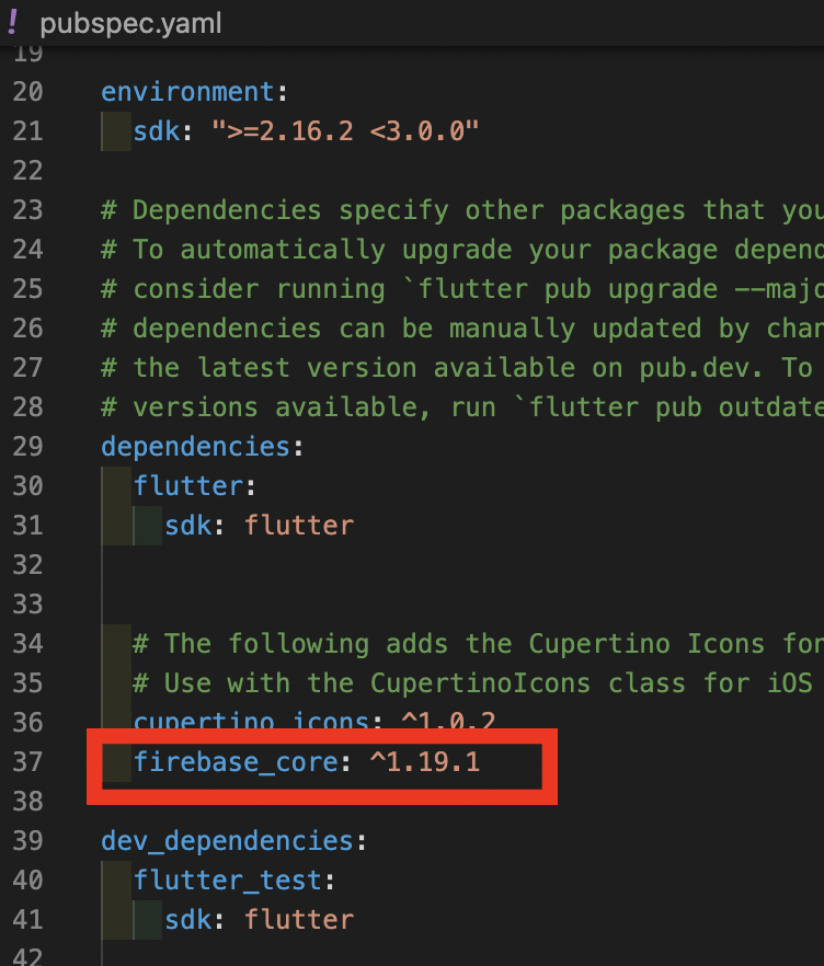 위 명령어를 입력하면 프로젝트폴더의 pubspec.yaml파일에 firebase_core가 자동으로 추가됩니다.