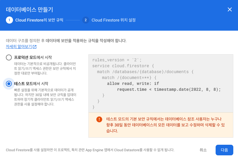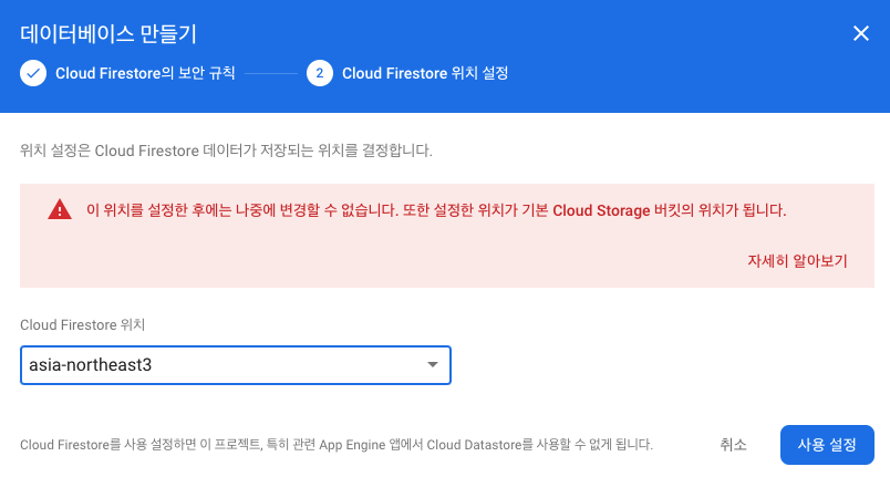 데이터를 저장하는 물리적 서버 위치이다. 어디를 선택해도 상관없지만 이왕이면 가까운곳에 있는게 0.0001초라도 빨리 송수신되지 않을까 해서 가장 가까운 asia-northeast3을 선택했다.