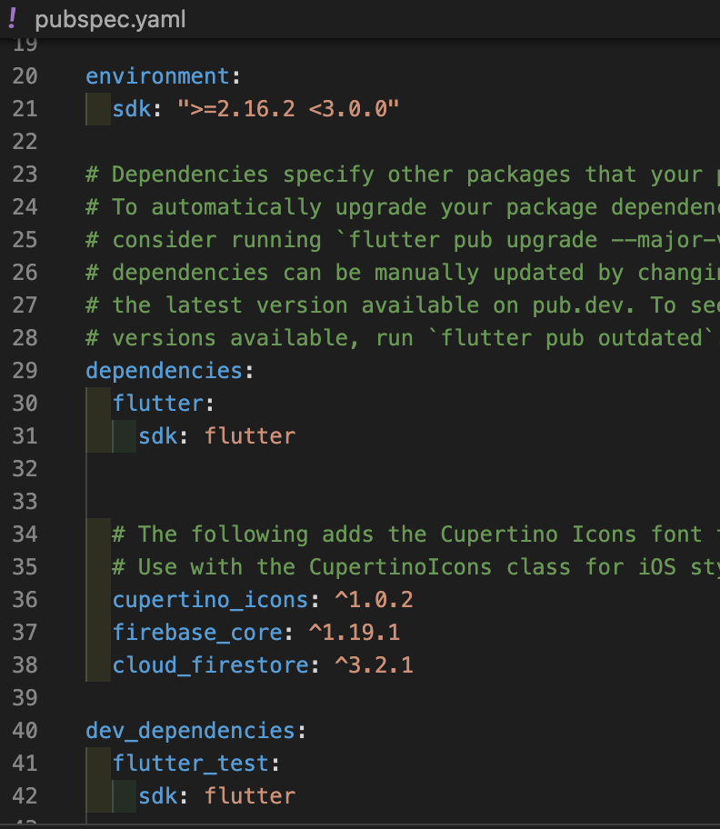 정상적으로 추가되었다면 pubspec.yaml 파일에 cloud_firestore가 추가된 것이 확인된다.