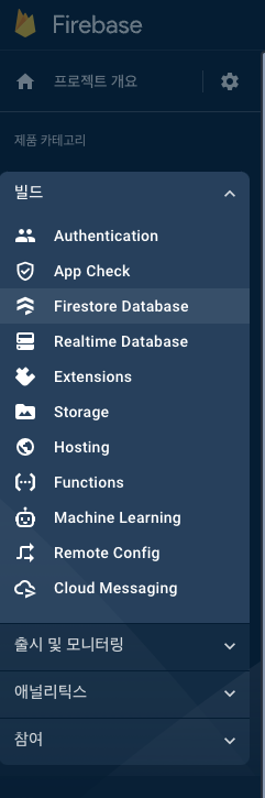 Firebase Console의 좌측 메뉴에서 빌드-Firestore Database를 클릭, '데이터베이스 만들기' 를 클릭한다.
