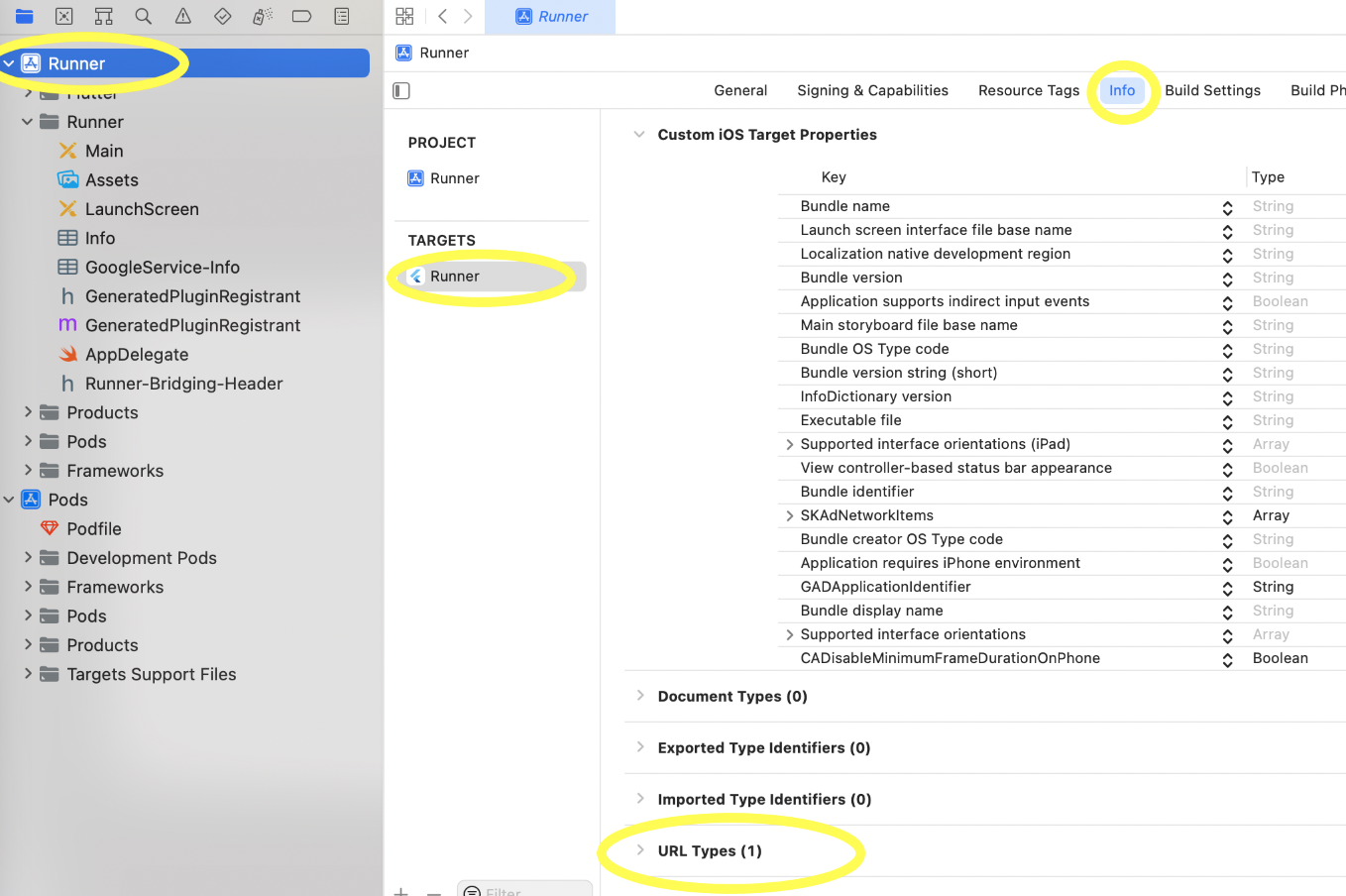 3.Runner(폴더 위 최상단 셋팅용)선택 -> 중간 TARGETS의 Runner 선택 -> 우측상단 info탭 선택 -> 가장 하단의 URL Types를 열어서 +누르고 URL스키마에 붙여넣기