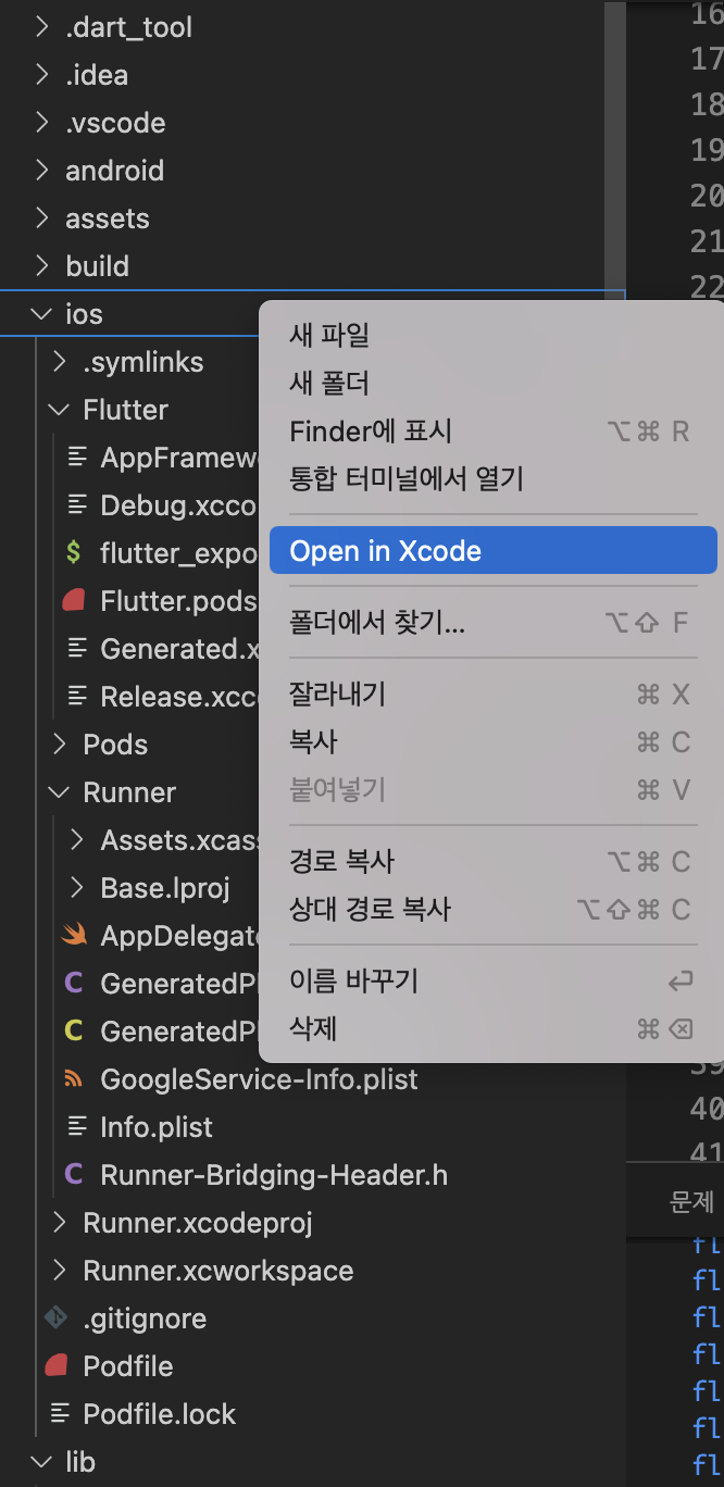 - 프로젝트 ios폴더 우클릭 - Open in Xcode 클릭
