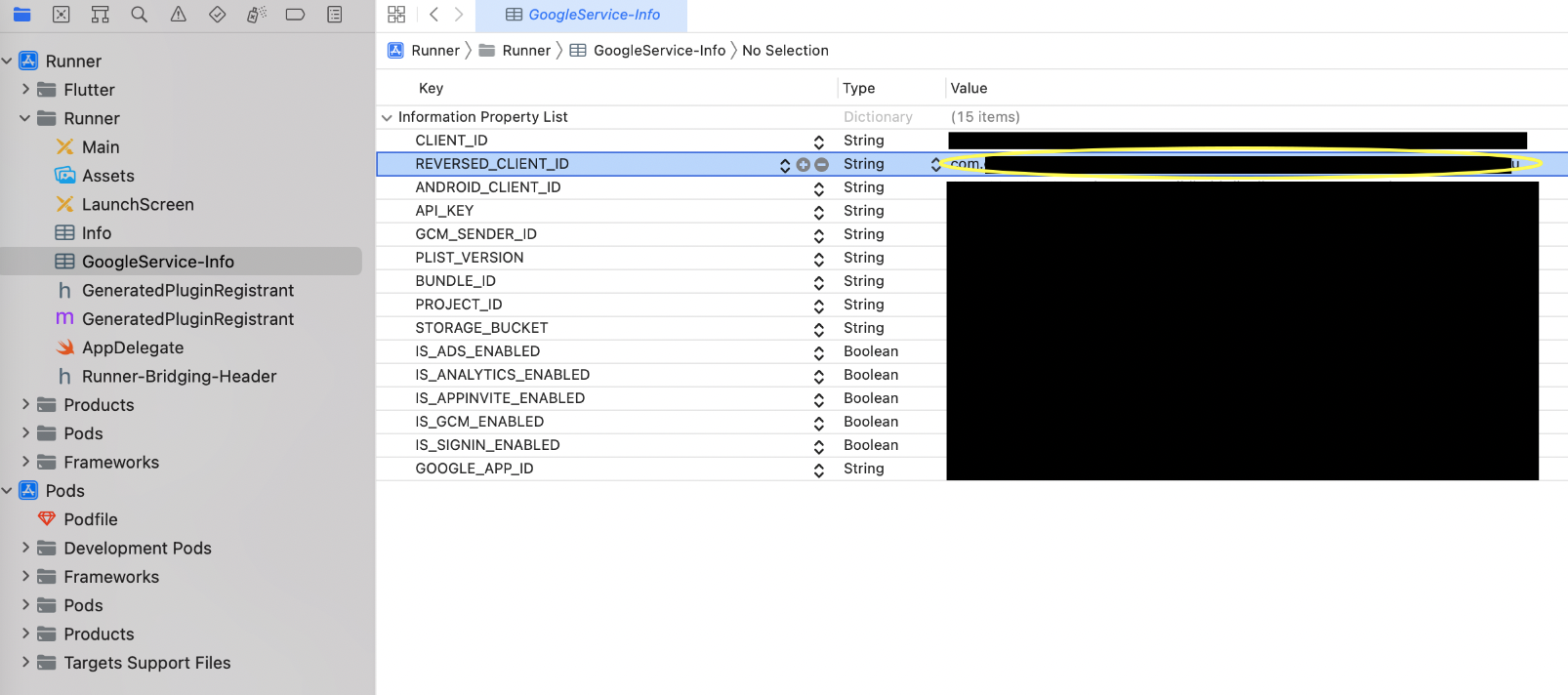 2. 좌측상단에서 폴더모양 클릭, Runner - GoogleService-Info 파일에서 [REVERSED_CLIENT_ID]복사